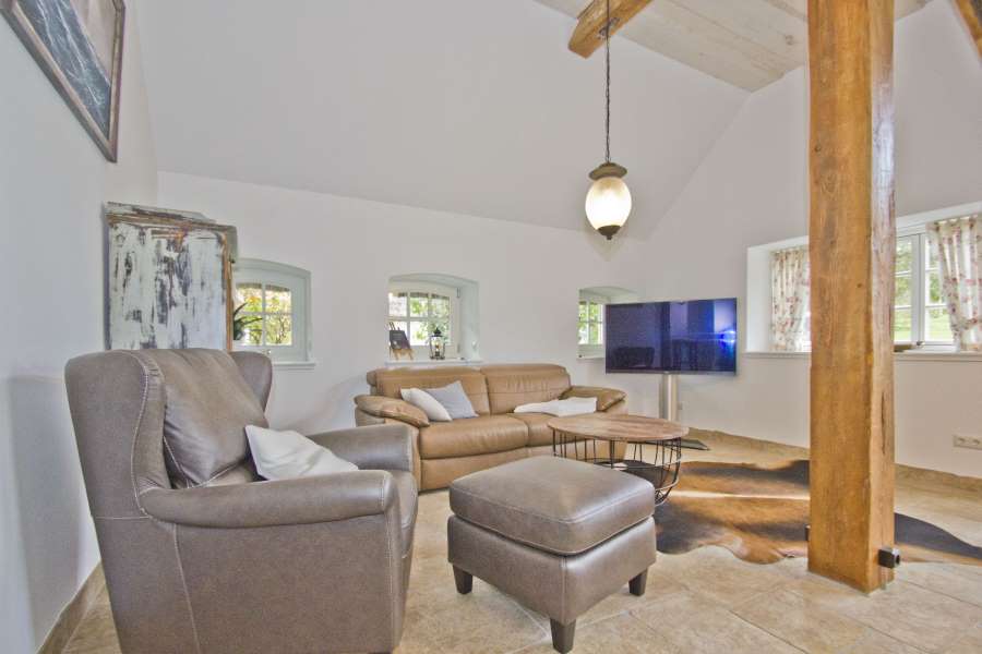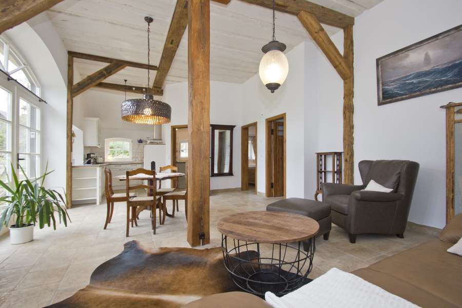 Nun befindet sich darin eine charmante Ferienwohnung, die in die ländliche Idylle längst vergangener Zeiten versetzt. Trotz des traditionellen Scheunencharakters ist die Wohnung modern durchdacht und ausgestattet. Ein Gaskamin sorgt im großzügigen Wohnbereich für gemütliche Wärme. Das urige Gebälk, hochwertige Möbel und alte Unikate aus dem Familienbesitz bieten eine besondere Atmosphäre für Euren Urlaub auf Rügen.